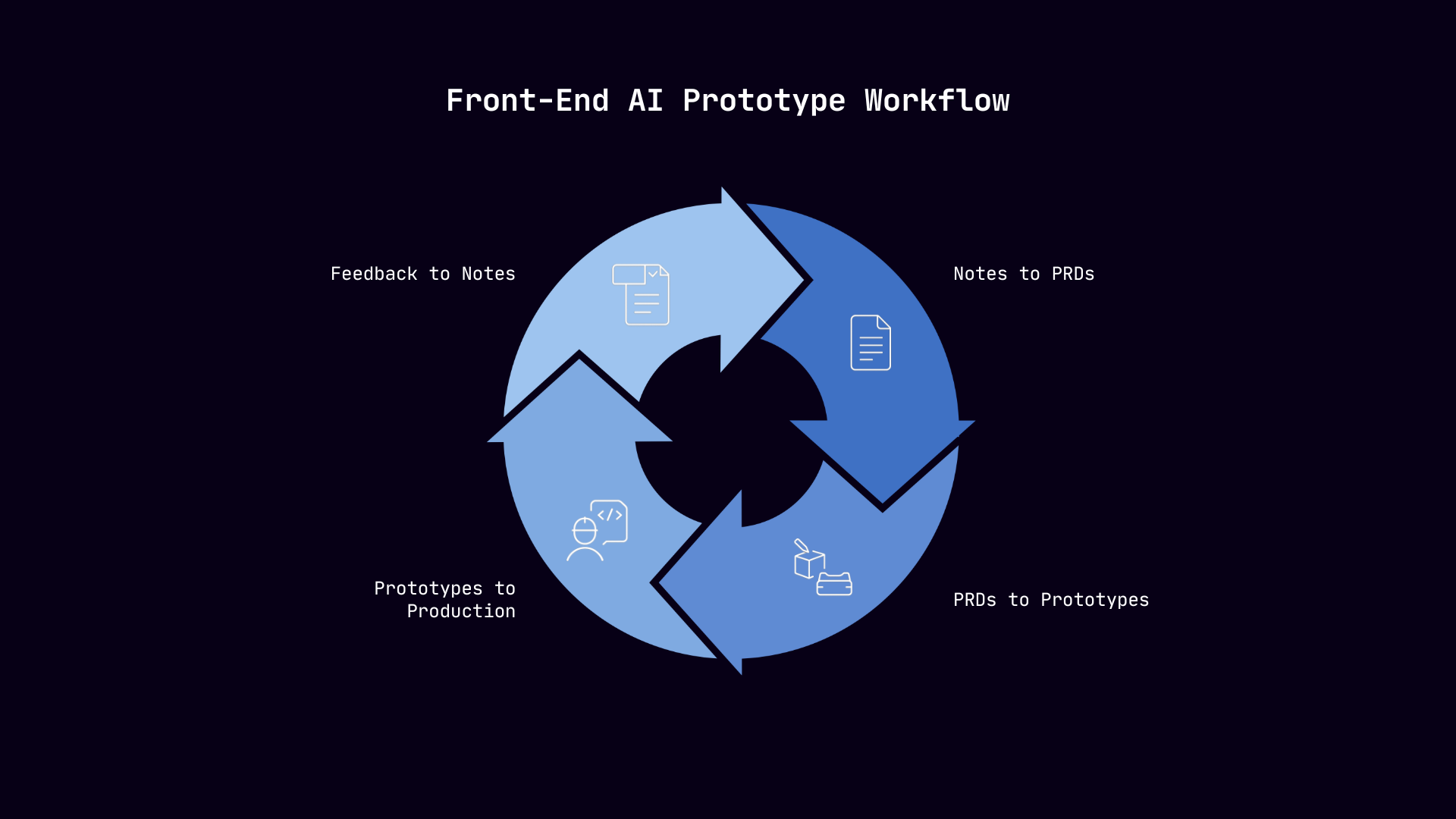 Notes → Product Requirement Documents (PRDs) → LLM Artifact Prototypes → Production Web Application → User Feedback → Notes